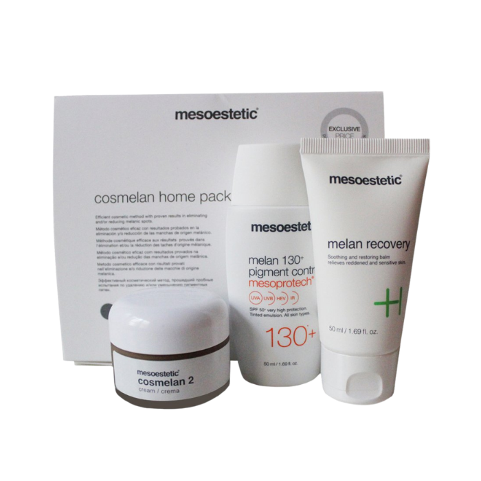 Cosmelan is one of the world’s best selling depigmentation cream. It has an intensive corrective action on skin hyperpigmentations while simultaneously regulating the overproduction of melanin in the melanocytes, inhibiting and controlling the appearance of new dark spots. It has a dual corrective and controlling action, achieving short- and long-term results by keeping hyperpigmentation under control by blocking tyrosinase activity. The maintenance kit consists of: * Cosmelan 2 Cream * Melan Recovery * Mesoprotech Melan 130+ Pigment Control Sunblock HOW TO USE The use of your Cosmelan home care will be discussed with you in detail during your Cosmelan in-clinic treatment